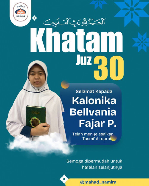 Alhamdulillah, salah satu capaian membanggakan kembali diraih. Ananda Bellva menuntaskan hafalan Juz 30 dengan baik melalui pembelajaran yang disiplin, muroja’ah yang konsisten, serta bimbingan ustadz dan ustadzah yang penuh kesabaran. Proses ini tidak hanya melatih ketekunan dalam menghafal, tetapi juga menumbuhkan kecintaan terhadap Al-Qur’an.