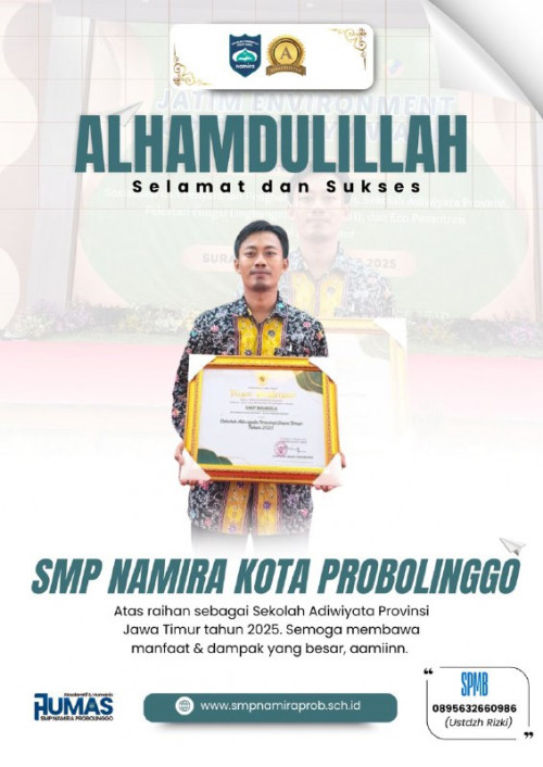 Selamat dan apresiasi setinggi-tingginya kepada SMP Namira atas diraihnya Penghargaan Sekolah Adiwiyata Tingkat Provinsi Jawa Timur. Semoga capaian ini semakin menguatkan komitmen sekolah dalam mewujudkan lingkungan belajar yang peduli dan berbudaya lingkungan.